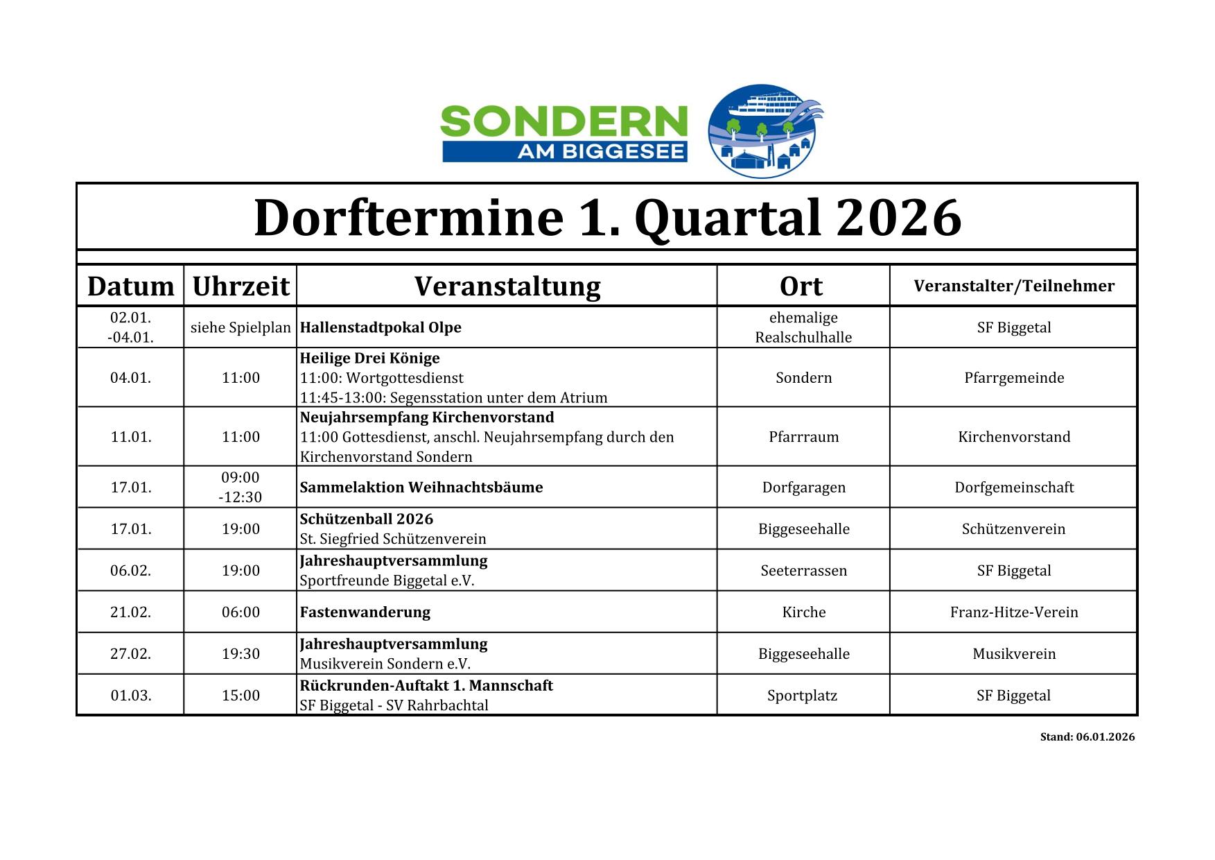 WDR auf´m Dorf Der WDR war zu Gast bei uns in Sondern. Unten der Link zur Sendung. Der Beitrag über Sonden fängt ab der Minute 22 an. WDR Lokalzeit vom 09.07.2025 Veranstaltungen Terminvorschau 2025 Dorftermine